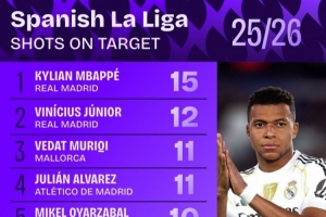 下一篇: 西甲参与进球次数排行:姆巴佩居首 维尼修斯第二、小蜘蛛第四