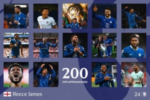 切尔西官推晒出海报,并写道:“200场里程碑取得进球,里斯-詹姆斯是纯血切尔西人。”