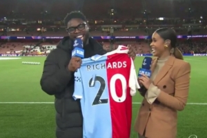 理查兹接到礼物时激动地喊道:“你们给我准备了礼物,这是什么礼物啊?”原来这是一件曼城和阿森纳缝合的球衣。