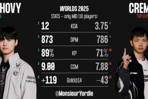 体育资讯10月23日讯 外媒统计TES与GEN中单数据对比,Creme在KDA、分均伤害、参团率、分均补刀、14分钟经济差均落后于Chovy。