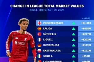 体育资讯10月25日讯 德国转会市场统计了欧洲各联赛2025年球员总身价的变化,并列出榜单,英超增加13.1亿欧最多,西甲增加4.18亿欧次席。