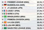 根据@SkillCorner的最新统计数据,全球十大足球联赛按球员在比赛中以超过15公里/小时的速度跑步的总距离比例进行排名。结果显示,英超球员在高强度奔跑上的比例领先全球。