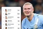 埃尔林·哈兰德目前在欧冠历史射手榜上排名第十。