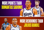 威少目前场均得分高于小萨(15.0>14.5)、场均篮板高于兰德尔 (7.1>6.9)、助攻比库里多(5.6>4.3)
