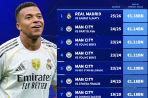 13.8亿欧!皇马vs凯拉特创欧冠最大身价差比赛,其余9席均为曼城