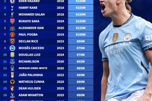 体育资讯11月12日讯 德国转会市场盘点了英超各队历史身价最高球员,哈兰德以2亿欧居首,阿扎尔、凯恩、萨拉赫和萨卡均为1.5亿欧。