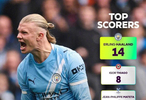 英超官方发布本赛季至今联赛射手榜排名,哈兰德14球领跑,蒂亚戈8球排名第二。