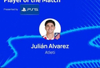 本场比赛阿尔瓦雷斯1粒进球2次助攻,赛后他也当选欧冠官方评选出的本场最佳球员。
