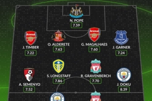 中场:塞梅尼奥(伯恩茅斯)、朗斯塔夫(利兹联)、赫拉芬贝赫(利物浦)、多库(曼城)