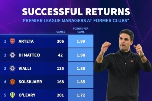 执教英超老东家场均积分排名:阿尔特塔1.99分居首,迪马特奥次席