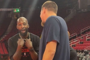 赛前,掘金球星约基奇在场边和火箭老将杰夫·格林热聊一波,双方曾在掘金当过队友。